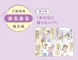 第4回 「あの日に帰りたい?!」 認知症特有の「帰宅願望」は不安感の裏返し。施設であれば、そこが落ち着けて、安心できる場所だと思ってもらえるように、常日頃からご利用者とのコミュニケーションを密にするようにしましょう。また年齢がわからなくなり、バリバリ働いていた頃に戻ってしまうことも多いので、今の居…