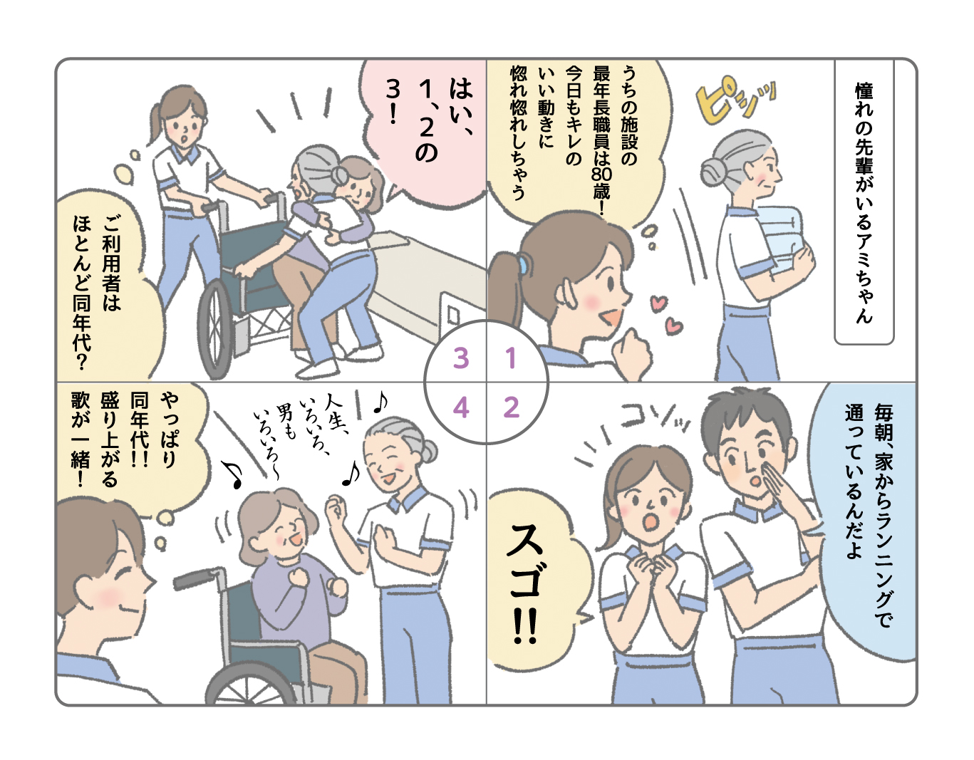 2024年9月号で取材させていただいた細井恵美子さんは、「医療には限界があるけれど、介護はその人の生活の質を高めるために限りなく力量を発揮することができる」という言葉に後押しされてキャリアを変遷しつつ、90歳を超えてなお介護現場に携わり続けています。働き手である自分にとってだけでなく、ご利用者のためにできることも無限にあるから、アミちゃんのような若い人にも「目指せ!生涯現役」と旗を振りたくなります。