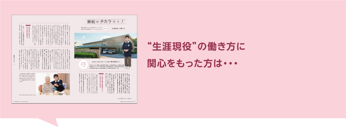 介護の仕事は、長く続けられることが魅力のひとつ。年を重ねるほどにご利用者の気持ちに寄り添えるようになるから、年齢は必ずしもハンディキャップになりません。また介護は多職種で支える仕事だから、看護職員、ケアマネジャー、生活相談員、機能訓練士、調理スタッフ、事務員など、もともとの専門以外のことを学んだり、自分の体調や環境に合わせていろいろなアプローチから関わることも可能です。言い換えれば、いくつになっても学び続け、生きがいを抱き続け、働き続けられる。まさに無限の可能性があるのが、介護の世界です。