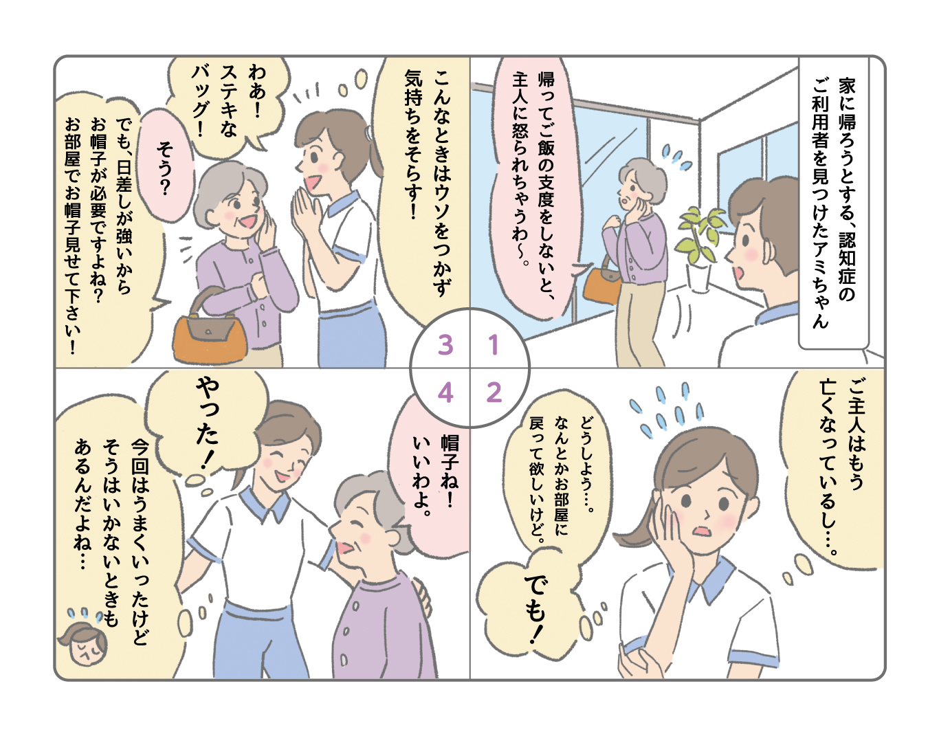 認知症特有の「帰宅願望」は不安感の裏返し。施設であれば、そこが落ち着けて、安心できる場所だと思ってもらえるように、常日頃からご利用者とのコミュニケーションを密にするようにしましょう。また年齢がわからなくなり、バリバリ働いていた頃に戻ってしまうことも多いので、今の居場所に自分の役割があると思ってもらえるように、できることはなるべくやっていただくのも効果的です。それでも帰ろうとする方を、できるだけ穏やかに引き留めるには「気持ちを逸らすこと」。今回のアミちゃんのように、その人が得意にしていることを質問責めにするのもよい方法で、おしゃれな方であれば、まずは装いを褒めて、ファッション談義にまでもっていければ大成功です。