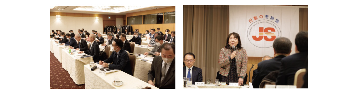 また、国の補正予算の成立によって介護職は月に最大1万9,000円の賃上げが可能となったことなどに触れ、「それでも他業種との格差は縮まらない。この厳しさをどうにか国会議員の皆さまにご理解いただかないとならない」と訴えた。11月26日、27日、12月1日には食費の基準費用額の引き上げと、期中改定についての要望書を高市早苗内閣総理大臣ら政府関係者に手交したことも報告した。選挙区の都県老施協の役員の皆様のご協力により実現したものだと謝意を述べ、「木原官房長官からは『これほどまでに利用者ファーストの要望書は初めて』という、うれしいお言葉もいただいた。代議員の皆さまに引き続きご協力いただきながら、今後も利用者のため、そして会員のためにしっかり汗をかいて陳情していく」との決意を力を込めて述べた。