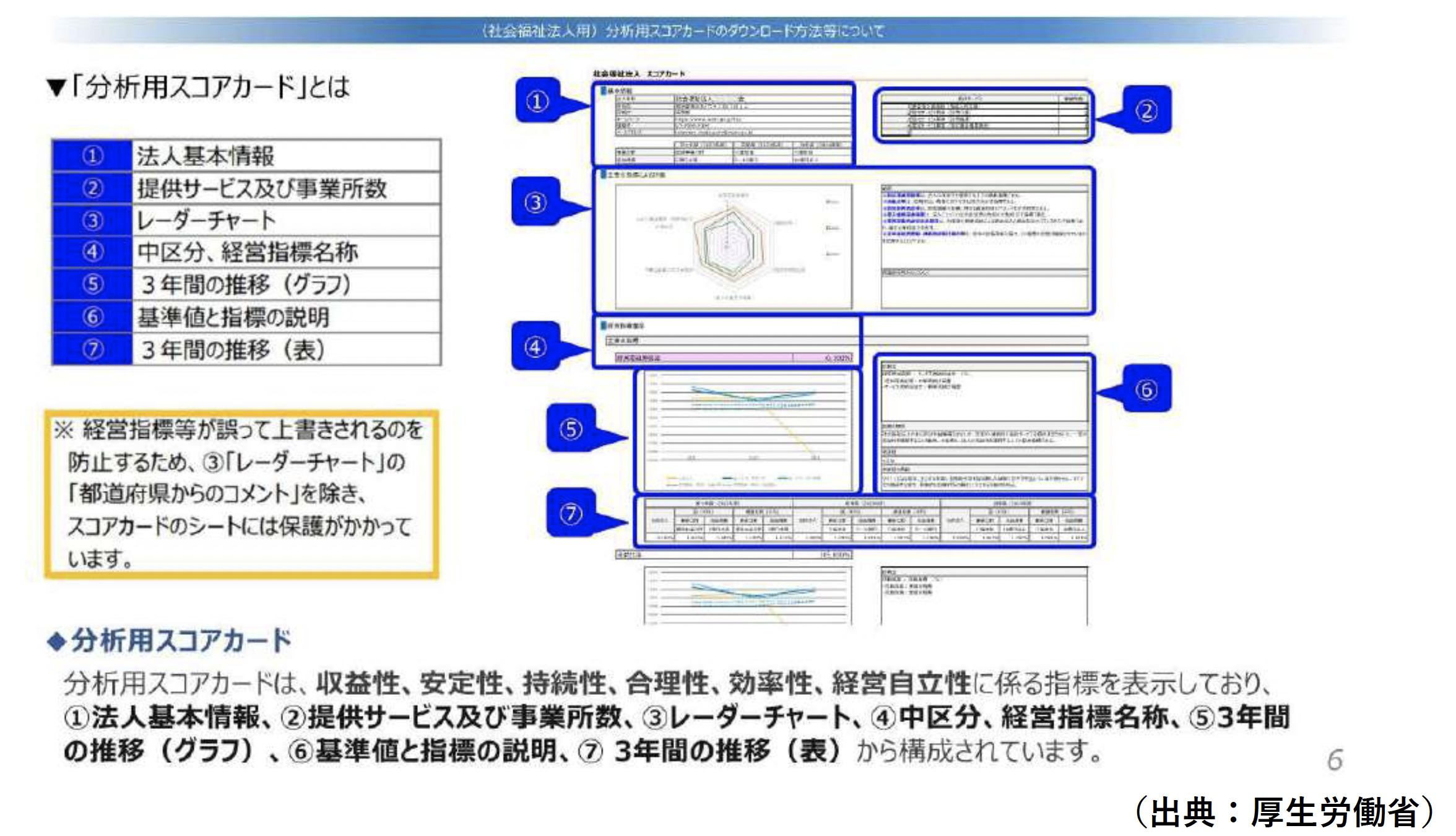 ・入手:電子開示システムの「分析」タブ→「スコアカードの入手」。年度(令和6年度以降)を選択し、Excel形式でダウンロード。