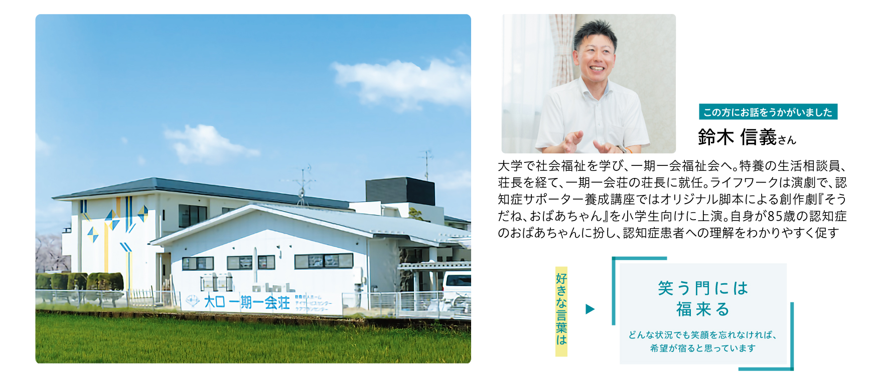 「二度とない出会いを大切にし、この出会いという宝物を感謝と尊敬の心で受け止め、常に思いやりと愛の心を持っておもてなしをすること」を理念に1986年に法人設立。現在、愛知県内の大口、岩倉、阿久比の各エリアで4つの施設を運営。今回訪ねた大口地区には、軽費老人ホームをはじめ、デイサービスセンター、ケアプランセンターがある