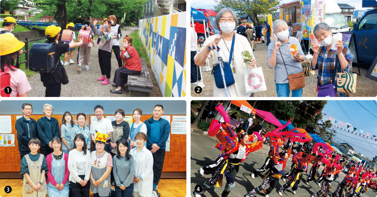 ❶ アウトリーチ活動にはご入居者も参加。写真は、通学路で小学生の見守り活動を行うご入居者。児童との挨拶が毎日の習慣になっている ❷「仲間ルシェ」では自分たちの作品を来場者に直接販売。それがご入居者の達成感につながった ❸ 荘長・鈴木さんを囲む職員の皆さん。かぶり物で場を和ませる明るさに、風通しのよい職場風土がにじむ ❹ 地元のよさこいチームもマルシェに出演。3チーム総勢80名による迫力ある演舞が会場をおおいに盛り上げた