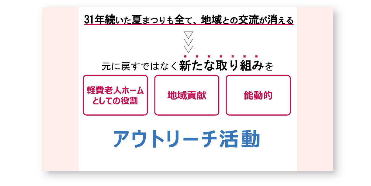 合い言葉は“能動的に動く”。軽費老人ホームとしての役割を見つめ直し、福祉のプロとして地域貢献を行うために、一期一会荘では新たな取り組みとして3つのポイントを掲げました。これらの取り組みを踏まえて生まれたのが、一期一会荘の「アウトリーチ活動」です