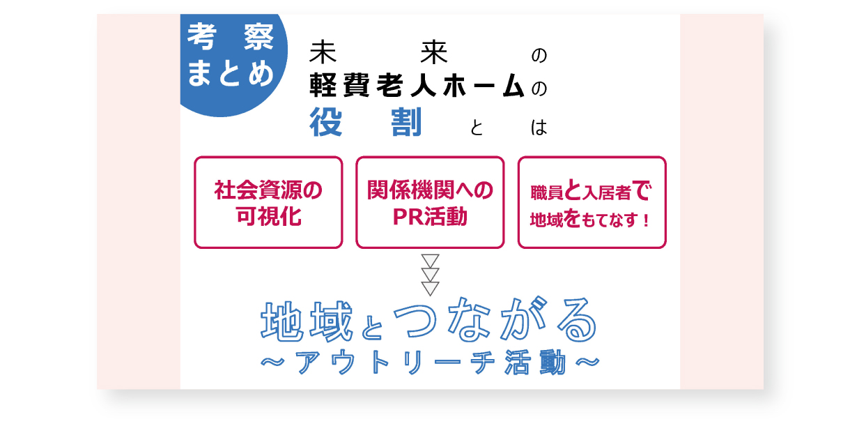 施設は多くのつながりに支えられています。そうした社会資源を可視化し活用するには、自治体との連携は必須です。また、職員とご入居者がともに地域をもてなすという視点をもつことが、ご入居者の残存機能の活用や社会性の再獲得にもつながると確信しています
