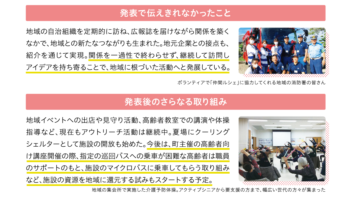 こうして築かれた顔の見える関係は施設への信頼につながり、軽費老人ホームという場の認知向上にも奏功しています。また、活動を続けるなかで地元企業とつながる機会も生まれ、仲間ルシェや地域行事への出店・協賛など、活動の幅を広げる力にもなっているのだそう。
