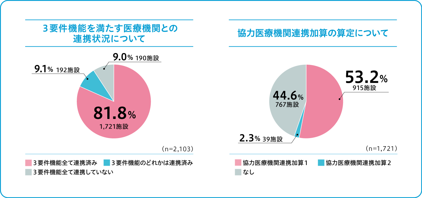 また、「3要件機能全て連携済み」と回答した1,721施設の「協力医療機関連携加算1」の算定状況が915施設(53.2%)と約半数に留まっていることも明らかになった。