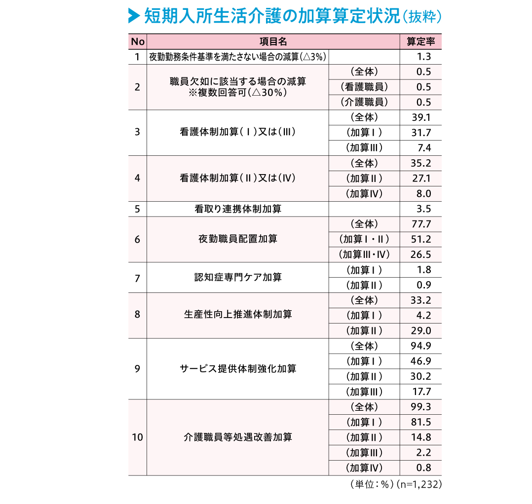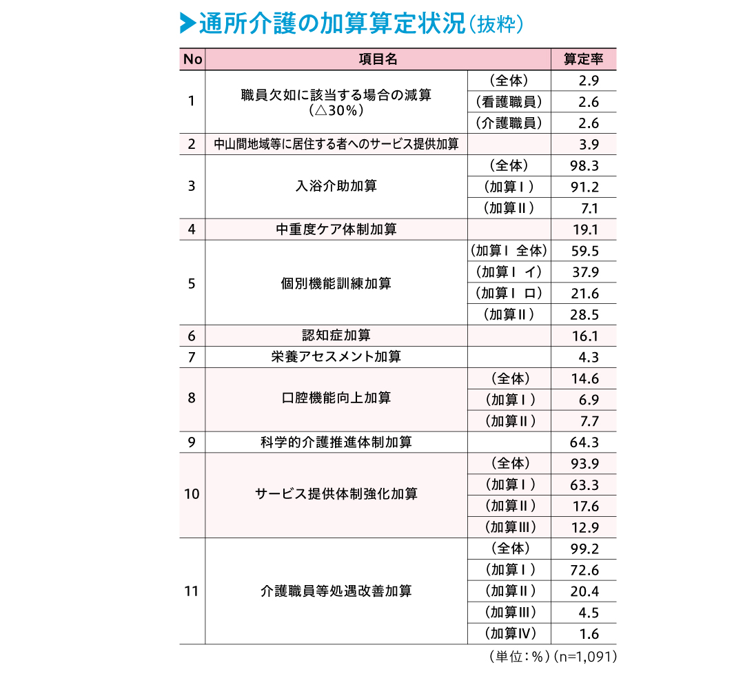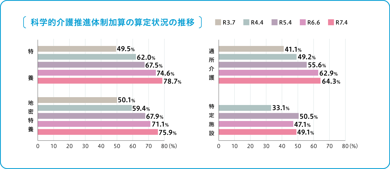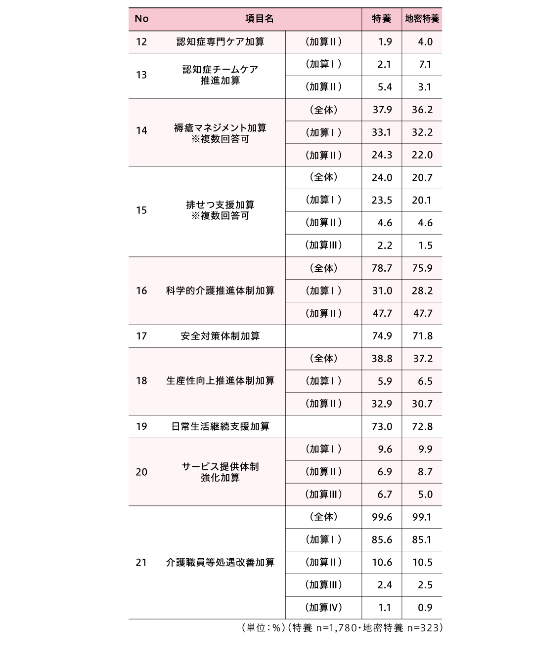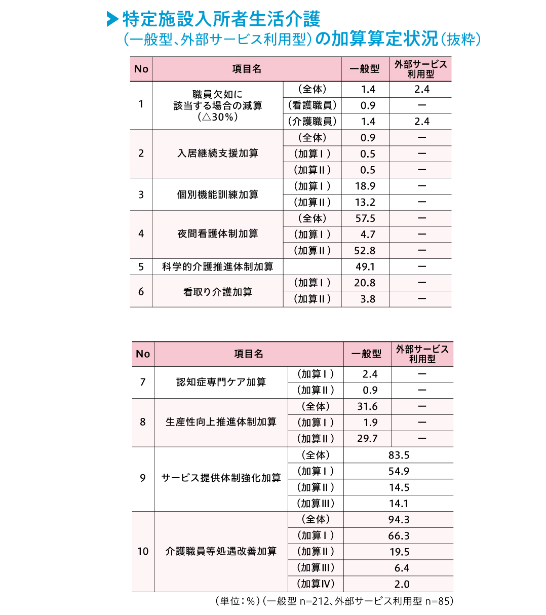 全国老施協では、介護事業の経営支援と、介護保険制度の見直し・介護報酬改定に向けた課題整理を目的として、令和3年度から会員施設を対象に継続的に加算算定状況調査を実施しています。