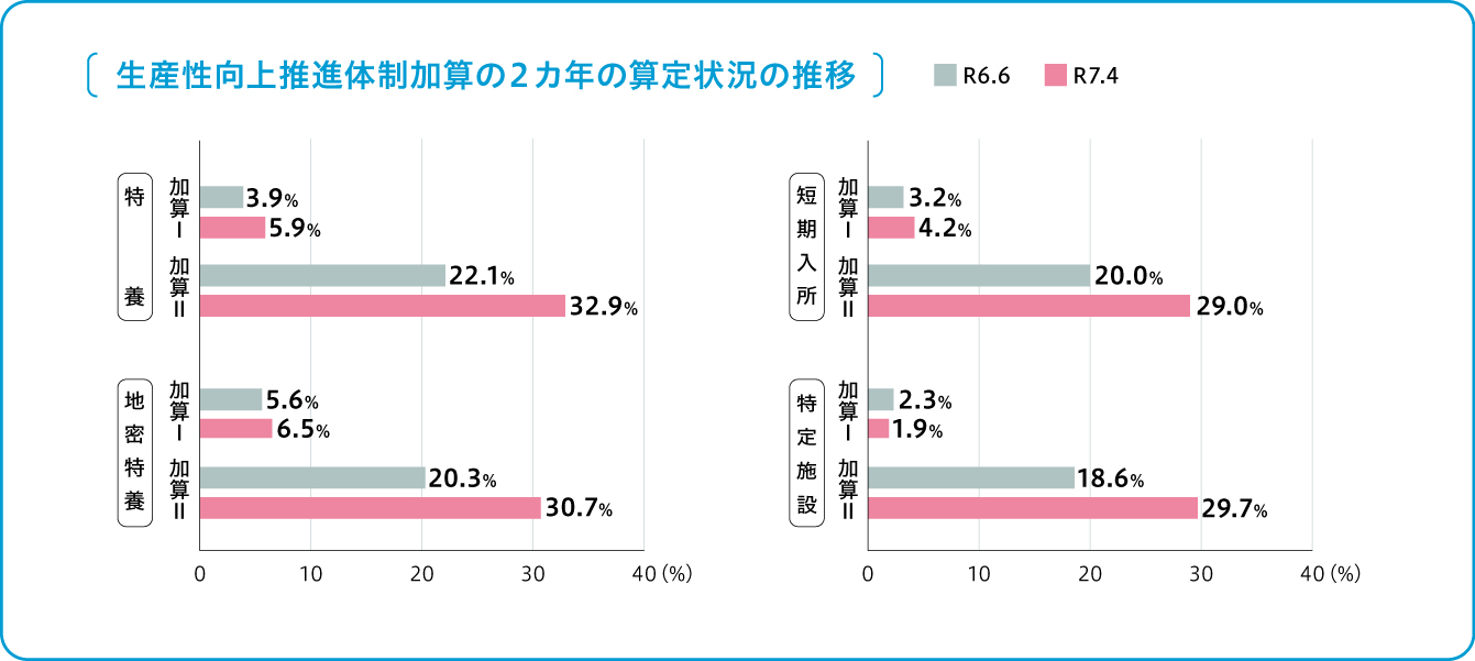 本加算は介護ロボットやICT等のテクノロジーの活用促進を評価するもので、特に加算Ⅱは生産性向上(業務効率化)の取組を広げるためのスタートラインとして、本会でも取得支援を進めている。加算Ⅱの算定率は、特養が22.1%から32.9%(10.8ポイント増)、地域密着型特養が20.3%から30.7%(10.4ポイント増)、短期入所が20.0%から29.0%(9.0ポイント増)、特定施設が18.6%から29.7%(11.1ポイント増)へ、それぞれ増加している。