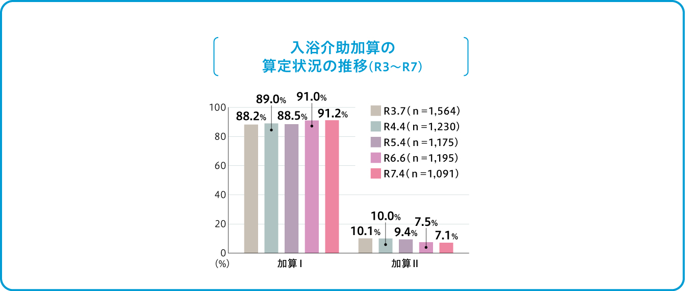 本加算は、令和6年改定で研修の実施が要件に加わるとともに(加算Ⅰ・Ⅱ)、介護職員が医師等に代わって自宅の状況を確認し、医師等が助言する場合でも算定可能となった(加算Ⅱ)。加算ⅠとⅡの算定率の合計を見ると継続して約98%の事業所が入浴介助加算を算定しているが、加算Ⅱの算定率が低調となっている。今後は「自宅でも安全に入浴できるようになりたい」というニーズの増加が見込まれるため、加算Ⅱの意義はさらに重要になると考えられる。
