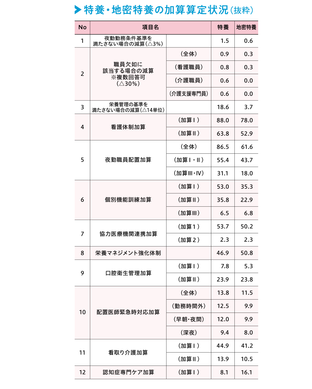 本特集では、令和6年改定で見直された、施設と協力医療機関との連携体制構築の状況、生産性向上推進体制加算の2年間の算定状況の推移、さらに、令和3年改定で新設されたLIFEに関連した科学的介護推進体制加算の算定状況の推移、及び、デイサービスで注視する加算についてご紹介します。