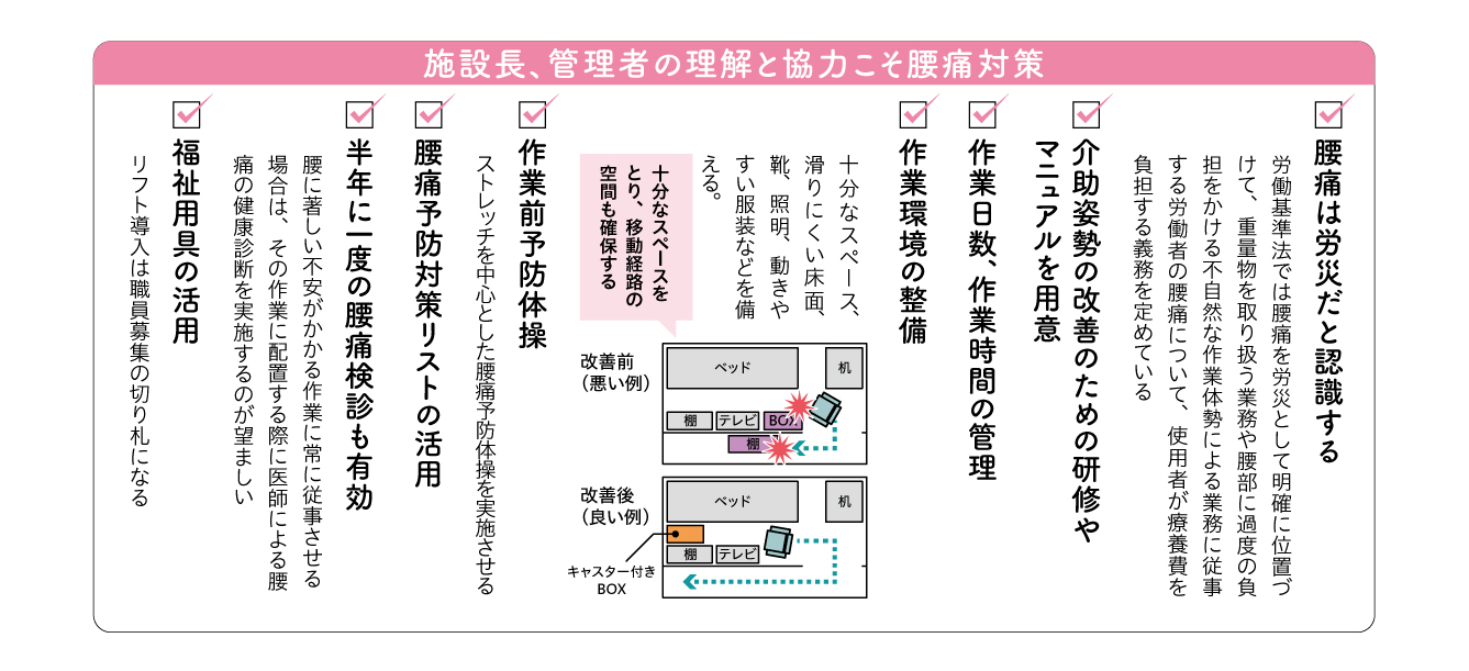 そこで今回は、施設の職場環境を考えるうえでの要となる、腰痛対策について解説します。