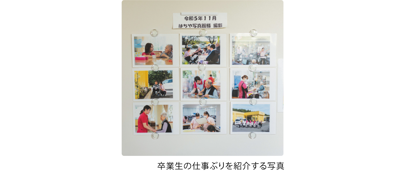 また、実際に研修を修了し介護福祉士となった先輩や、今まさに勉強しながら活躍している若手職員の姿などを、動画を作成して見てもらっています。若手職員を多用した動画は、学生さんに「自分と近い年齢の人が活躍している」と親近感を与えるツールとして有効です。
