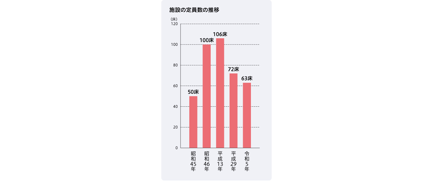 平成29年にはサービス付き高齢者向け住宅「さくらハイツ」の工事開始とともに、特別養護老人ホーム定員14名を削減。従来型は52名から36名へ。ユニット型は34名から36名にしました。令和5年には特別養護老人ホーム定員が72床から63床へと9床減少し、そのうち従来型は24床へと12床減少し、ユニット型は39床へと3床増えています。令和5年4月には、要介護1・2の特例入居の定員を芦別市と協議して1割(8名)から1・5割(13名)に変更して入居者を増やしました。