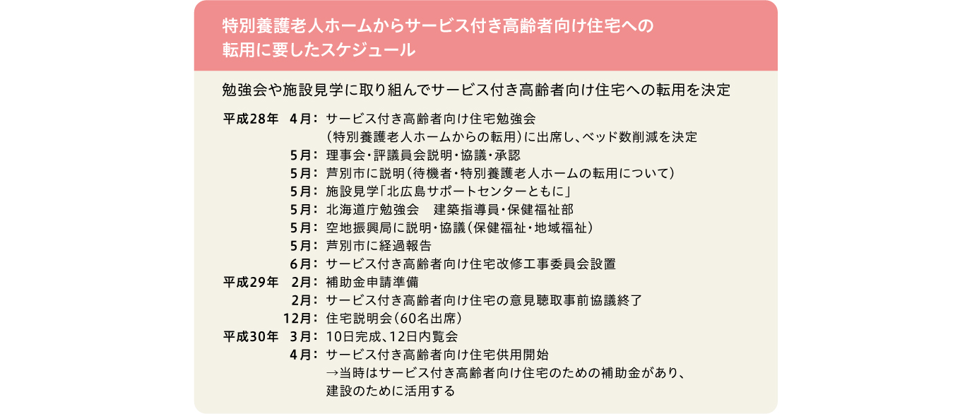 また、今年4月には従来型特養の一部を地域密着型特養に転換しました。定員を36床から24床に削減することで、広域型から地域密着型への変更が必要になり、道の所管から市の所管へと移る手続きを進めました。地域密着型の方が介護報酬の単価が若干高く、経営的にはプラスに作用しています。