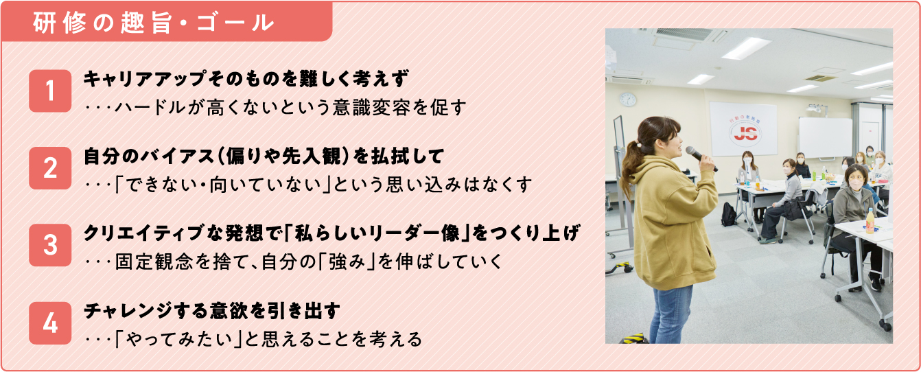 研修は女性キャリアアップ推進委員会若林久美子委員長のあいさつでスタート。若林委員長は22年間にわたる施設長としての経験を振り返り、「職員さんと利用者さん、どちらにもしわ寄せがいかないよう、両者を同じくらい大切にすることを第一に考えています。皆さんはどのような施設長になりたいのか、今日はたくさんお話を聞きながら、ぜひ一緒に勉強させてください」と話しました。