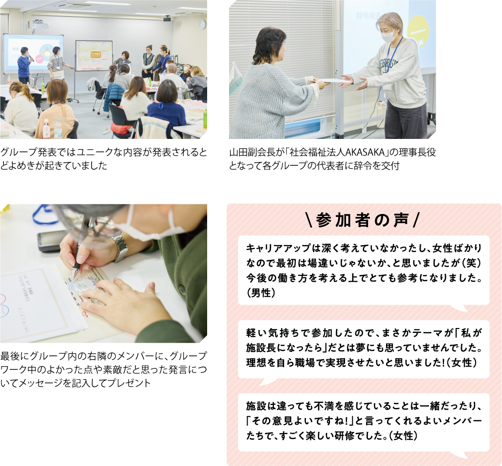 グループワークでは理想の施設長像についてさまざまな意見が飛び交い、各グループ大いに盛り上がりました。休憩をはさんで模造紙にまとめた内容をグループごとに発表したあと、山田副会長より参加者全員に施設長の辞令が交付され、研修は終了となりました。