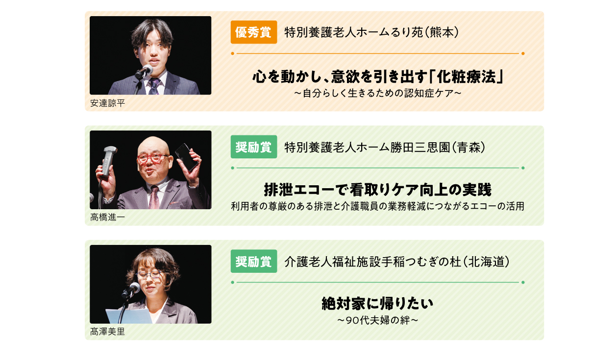 休憩を挟んで後半は、▶︎特別養護老人ホームエル・グレイス六甲(兵庫/西川沙羅)が登壇。「法人理念を日々のケアにどのように展開していくか」をテーマに、法人理念を現場実践へ結びつける道筋を示しました。続いて、▶︎特別養護老人ホームるり苑(熊本/安達諒平)は、「心を動かし、意欲を引き出す『化粧療法』」を通じて、BPSD軽減と意欲・ADLの改善を科学的に提示し、生活の彩りが回復する過程を共有。「化粧をする行為で五感を刺激することでご利用者の脳が活性化され、認知機能の改善が見られた」と、その意義を総括しました。最後に、▶︎特別養護老人ホーム石内慈光園(広島/白川ゆかり)が「一人ひとりの看取り、ここでよかった」と題して、家族と職員双方の不安に寄り添う看取り体制を提案しました。 審査の結果、排泄エコーという新発想で尊厳ある排泄から看取り・日常ケアへと波及効果をもたらした勝田三思園と、多職種で協働し「90代でも在宅に戻れる」という希望を現実として示した手稲つむぎの杜が奨励賞を受賞。多職種連携のもと化粧という日常行為を“生きる力”へとつなぎ、成果を明確に提示したるり苑が優秀賞を受賞しました。