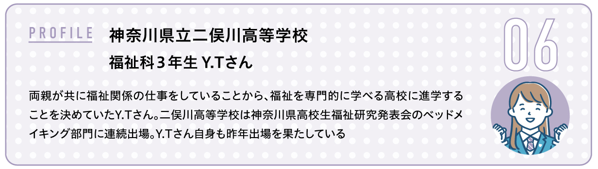 実習のための施設が充実しているのも、この高校を選んだ理由です。特に特別養護老人ホームでの実習を通じて介護の楽しさやご利用者さんとの関わりを体験し、この仕事の意義を実感できました。「福祉は人生に触れられる貴重な機会なのだ」と思うようになり、ベッドメイキングなどの技術の習得にも力が入りました。実習では緊張してしまって、上手に話せないこともあるのですが、自分とコミュニケーションをとってくださっているご利用者さんを笑顔にできたらいいなと思いました。 卒業後は進学して、介護福祉士の資格を取得したいです。資格を取るために勉強することが、ご利用者さんによりよい介護を提供することにつながるのではないかと思うからです。
