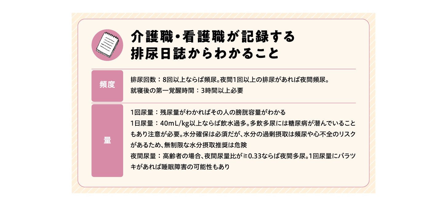 高齢者の排尿症状は多岐にわたります。失禁にも複数のタイプが存在し、症状が重複している可能性もあります。個々の高齢者がどの症状で困っていて、その原因がどこにあるのかを具体的に把握するためには、尿量や頻度などの情報をもとに排泄の状態を正確に判断することが必要になります。そのための貴重な情報となるのが、介護職が中心となって集めた記録や数値です。