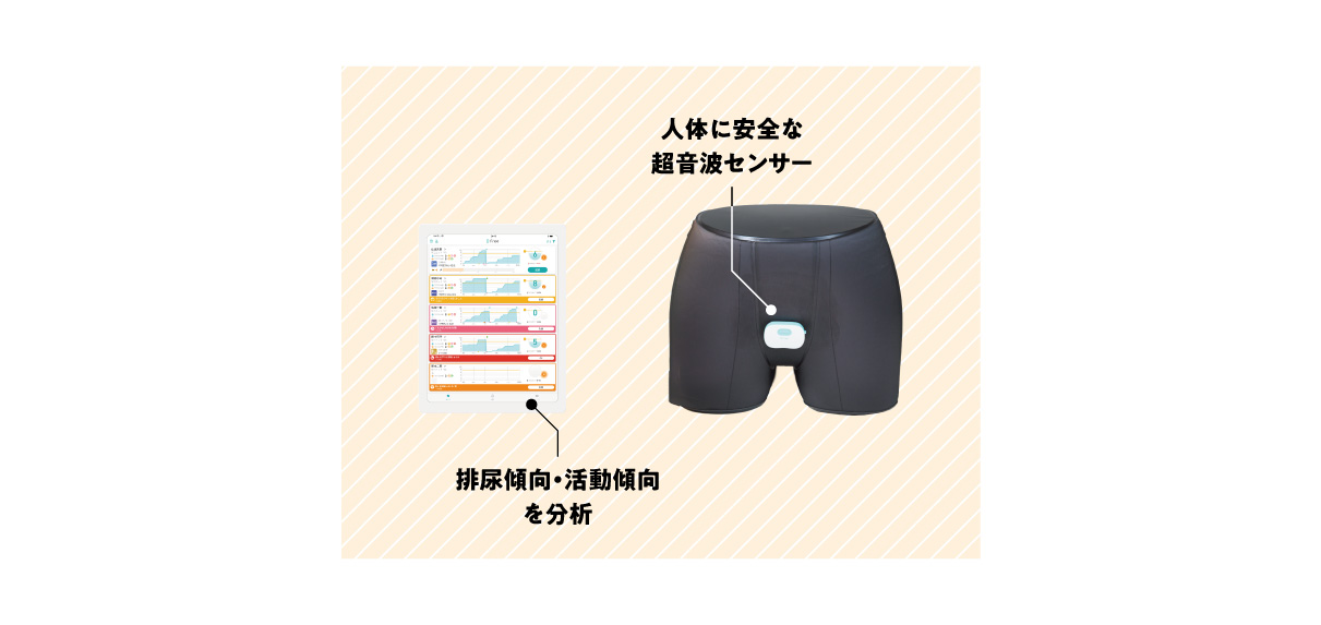 作ったのは小型の超音波センサーをご利用者様のお腹に貼り付けることで、尿のたまり具合をリアルタイムでモニターに表示する機器。膀胱内の尿のたまり具合や前回の排尿時刻、これまでの排尿履歴などでその方の排泄傾向を把握したり、「そろそろ通知」や「でたかも通知」などのお知らせ機能を活用することで、漏れの悩みやパッドの無駄を減らします。複数のご利用者様の排尿予測を一つの画面で一括管理することも可能です。